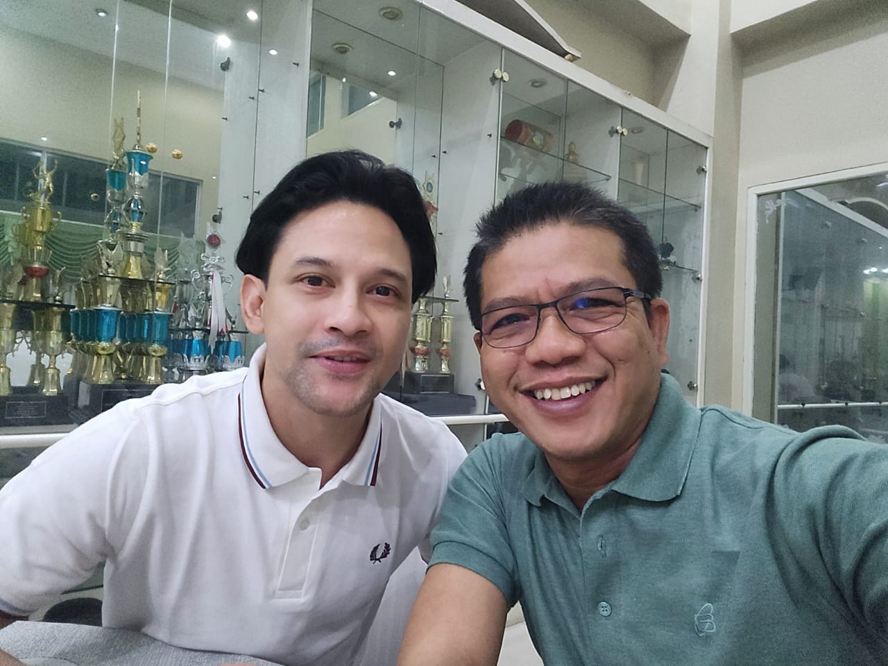 Keduanya tampak kompak sama-sama memakai polo shirt meski pun beda warna, polo shirt dadang supriatna berwarna hijau sedangkan lucky berwarna putih.